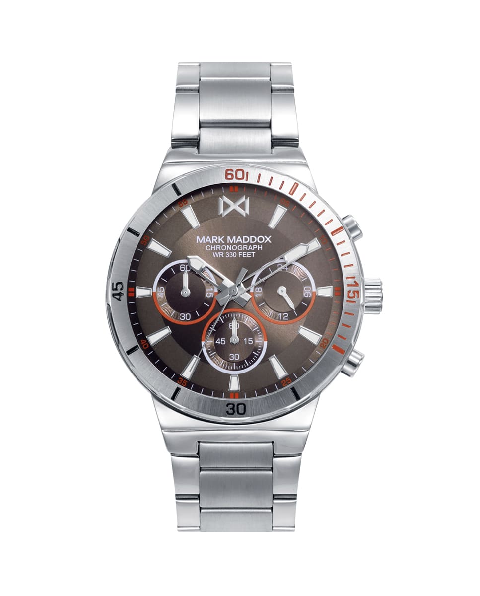 La Originalidad Personificada En Un Reloj Para Hombre, Con Cronógrafo, Caja Y Brazalete De Acero Gris Con Marco De Contadores En Naranja Y Blanco. El Complemento Que Dará Que Hablar, Lúcelo Con Tus Mejores Outfits Y No Pasarás Desapercibido.