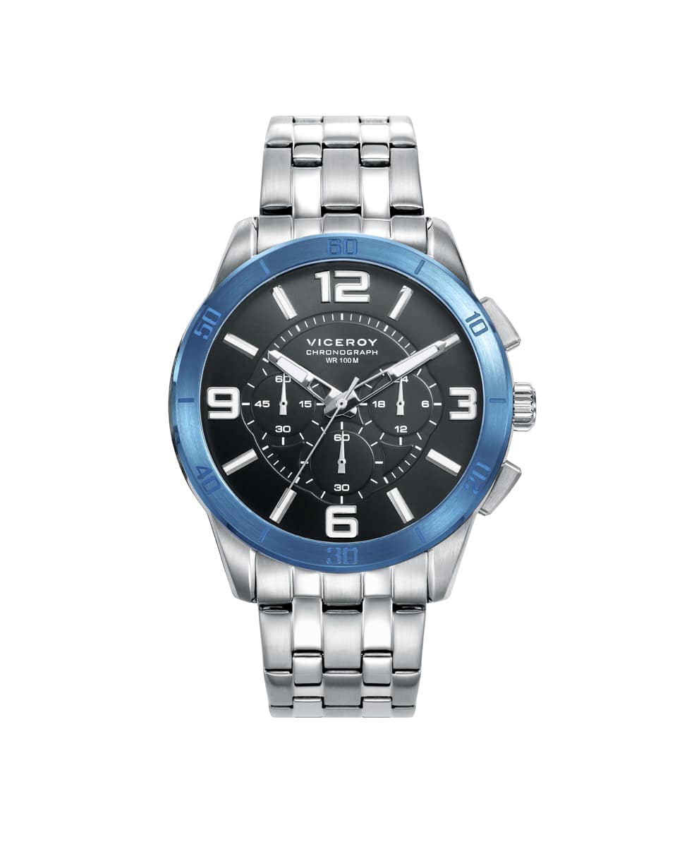 Reloj De Hombre Viceroy Heat Cronógrafo Con La Caja Y El Brazalete De Acero, El Bisel Con Ip Azul, La Esfera Enn Negro Con Los Contadores A Las 3, 6 Y 9 Y Los Índices En Blanco Y Plateado
