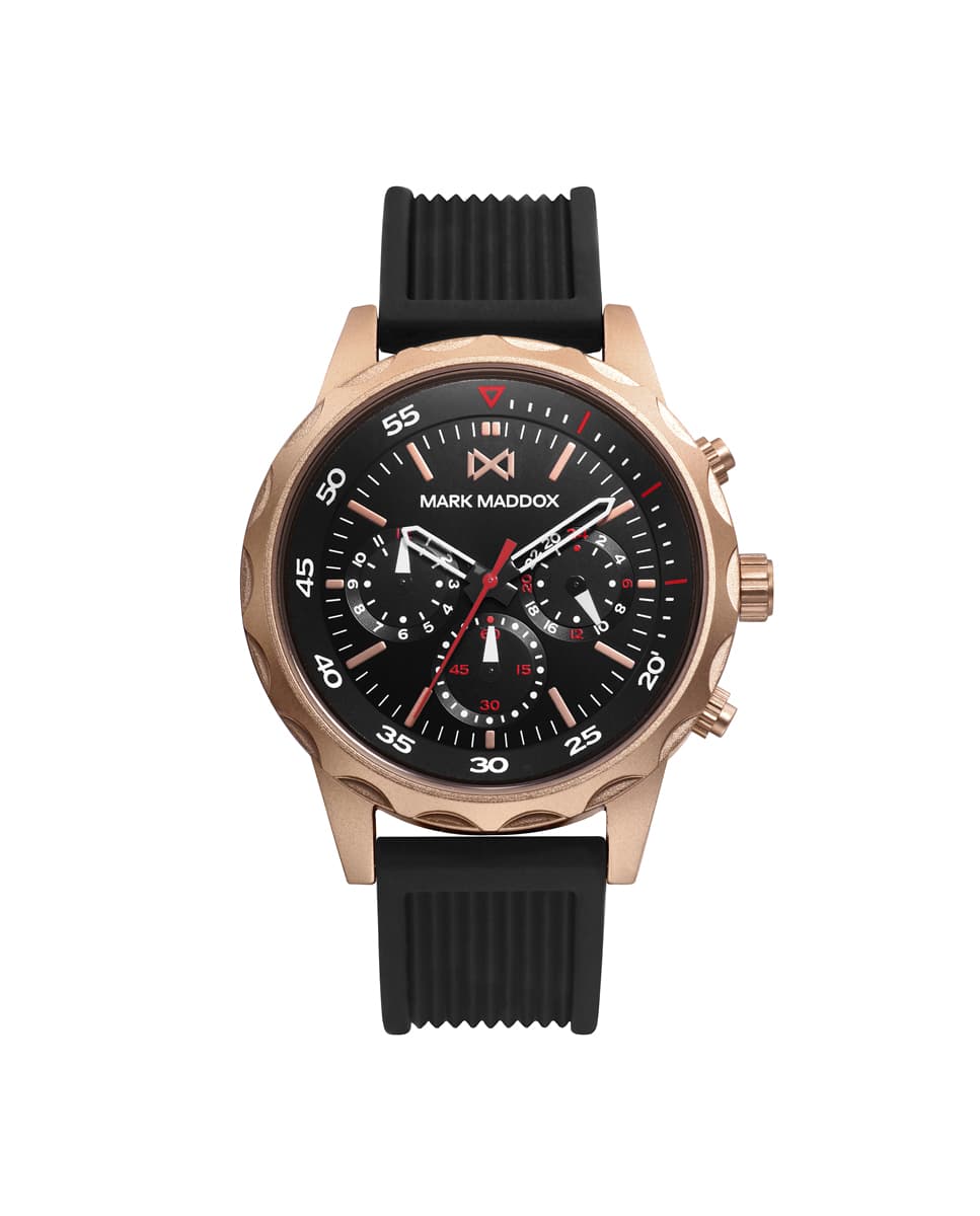 Reloj De Hombre Mark Maddox Mission, Multifunción, Caja De Aluminio En Ip Rosa Con Correa Negra Y Esfera Negra Con Indicadoras En Blanca Y Segundos En Roja