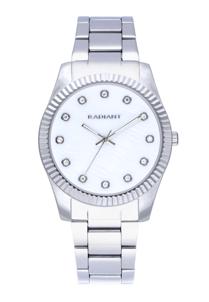 El reloj Radiant para mujer con referencia RA610201 tiene un diseño atemporal, elegante y clásico. Analógico de tres agujas, con movimiento MIYOTA 2035 y una resistencia al agua de hasta 3 ATM. Cuenta con una esfera de madre perla blanca y viene con un brazaleteplateado y detalles de cristales en la esfera.