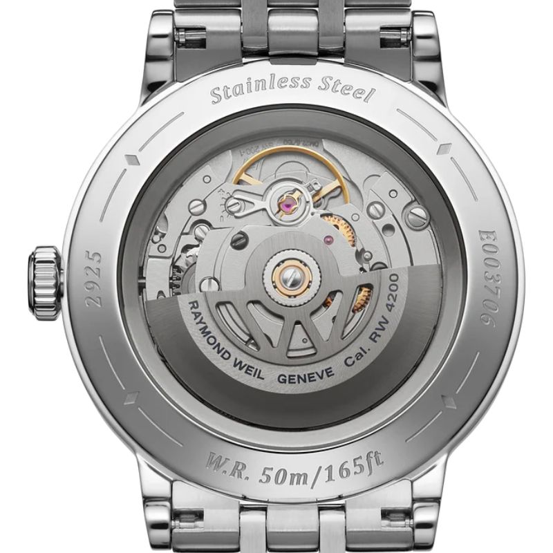 El segundero central añade dinamismo y precisión a la lectura, mientras que el cristal de zafiro antirrayas protege la esfera con claridad y resistencia, asegurando durabilidad incluso en el uso diario más exigente. La corona grabada con el logotipo Raymond Weil y el fondo pulido complementan la estética cuidada y la funcionalidad del reloj, evidenciando un diseño pensado para los amantes de la relojería clásica con un toque moderno.