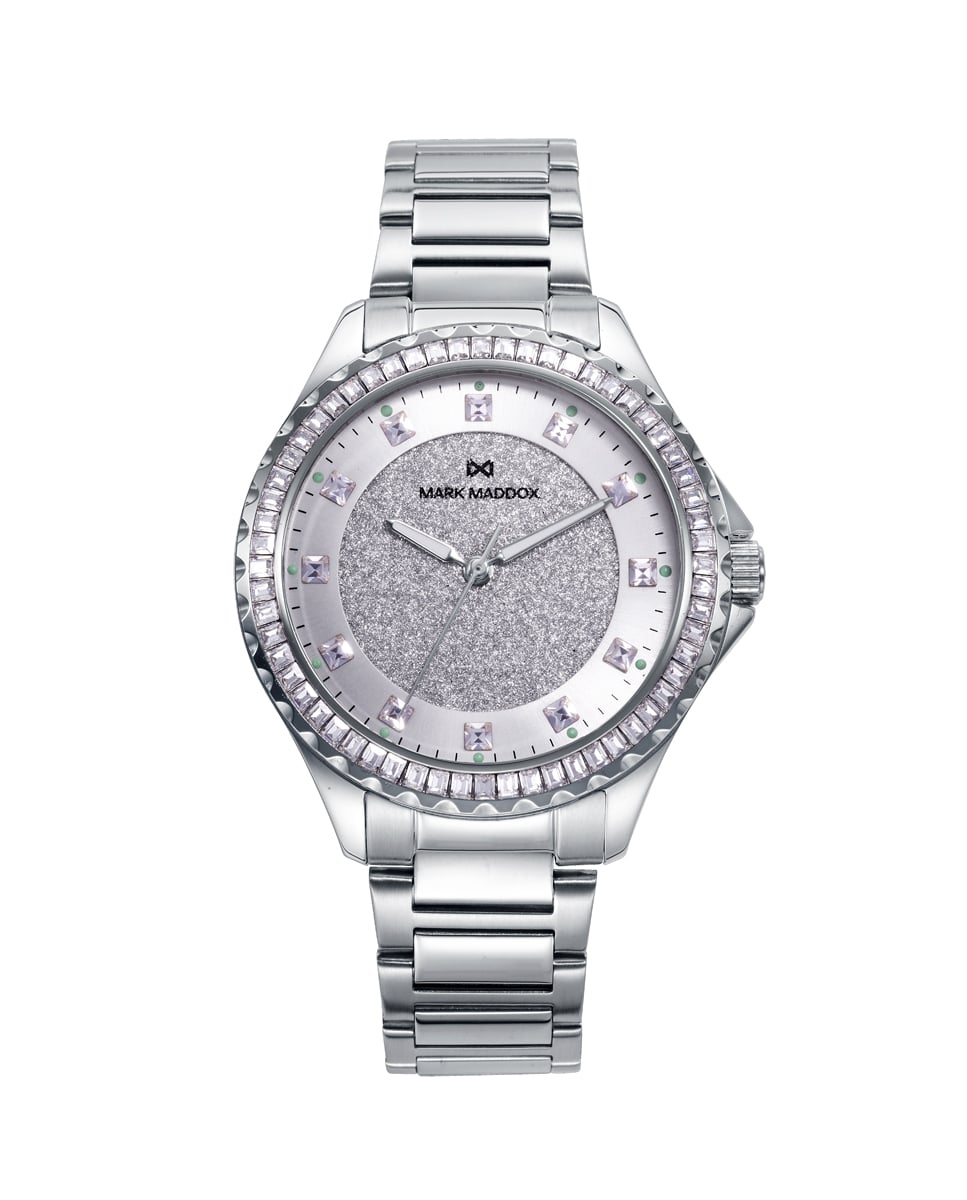 Reloj De Mujer Tooting Mark Maddox Tres Agujas Con Caja Y Brazalete En Acero , Esfera Plata Con Glitter Y Circonitas, Bisel Con Circonitas.