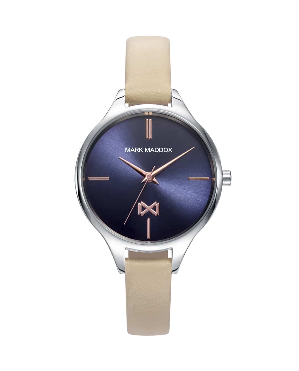 Reloj De Mujer Mark Maddox Astoria Tres Agujas De Acero. Con Esfera Azul, Indicadores En Color Oro Rosa Y Correa De Piel Color Natural