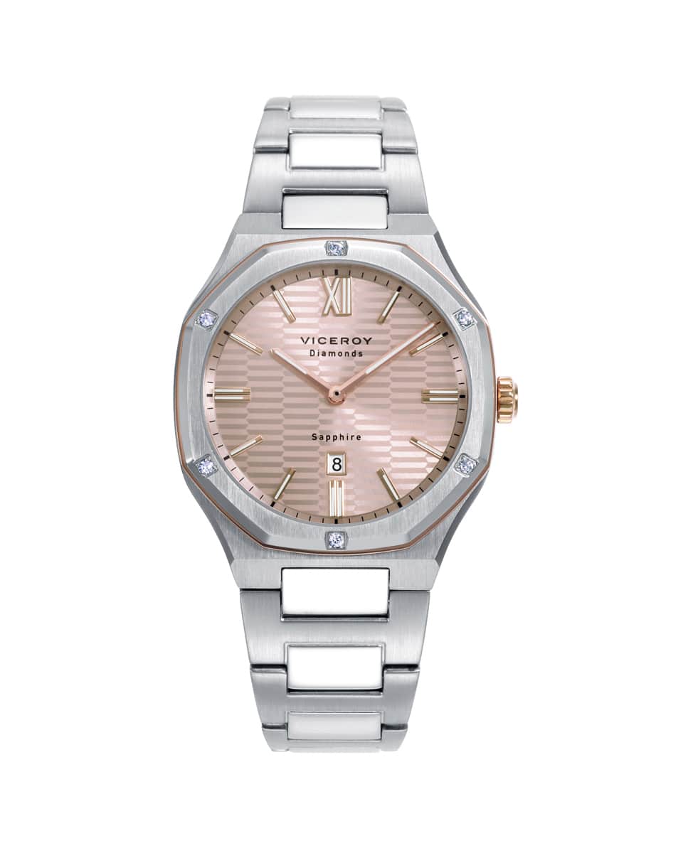 Este Exquisito Reloj De La Colección Laura Escanes Para Mujer Es La Definición De Lujo Y Elegancia Moderna. Diseñado Con Una Caja De Acero Extraplana Que Incorpora Un Doble Bisel En Acero E Ip Rosa, Adornado Con Deslumbrantes Diamantes Creados, Este Modelo Destaca Por Su Sofisticación Y Brillo. La Esfera En Tono Rosa, Delicada Y Femenina, Se Combina Perfectamente Con Índices Y Agujas En Color Ip Rosa, Creando Una Armonía Visual Que Resalta Su Exclusividad. El Cristal De Zafiro Proporciona Una Resistencia Duradera Y Un Acabado Impecable, Mientras Que El Brazalete De Acero Añade Un Toque Robusto Y Refinado Al Conjunto. Además, Cuenta Con Un Calendario Que Aporta Funcionalidad Sin Sacrificar Su Diseño Estilizado. Este Reloj De La Colección Laura Escanes Es Ideal Para Mujeres Que Buscan Una Pieza Única, Capaz De Combinar Lujo, Estilo Y Una Esencia Moderna En Cada Detalle. Sumergible 10 Atm.