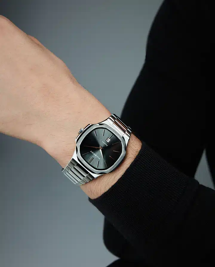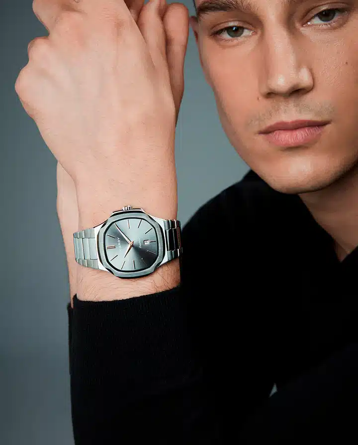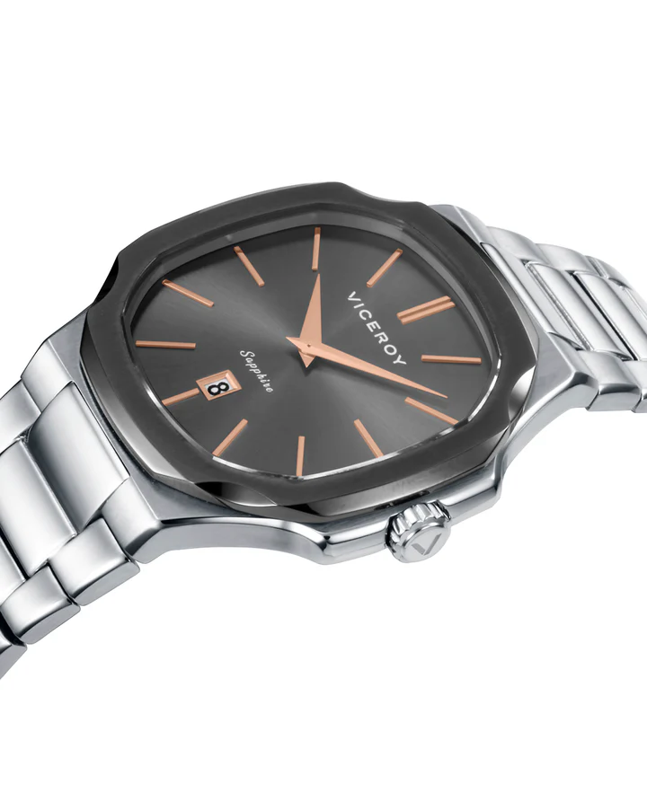 Reloj De Hombre Colección Laura Escanes Dos Agujas Con Calendario , Caja Bitono De Acero E Ip Gris 10 Atm, Brazalete De Acero Solido, Esfera Gris Con Índices En Color Ip Rosa, Agujas Horarias En Color Ip Rosa, Cristal Zafiro.