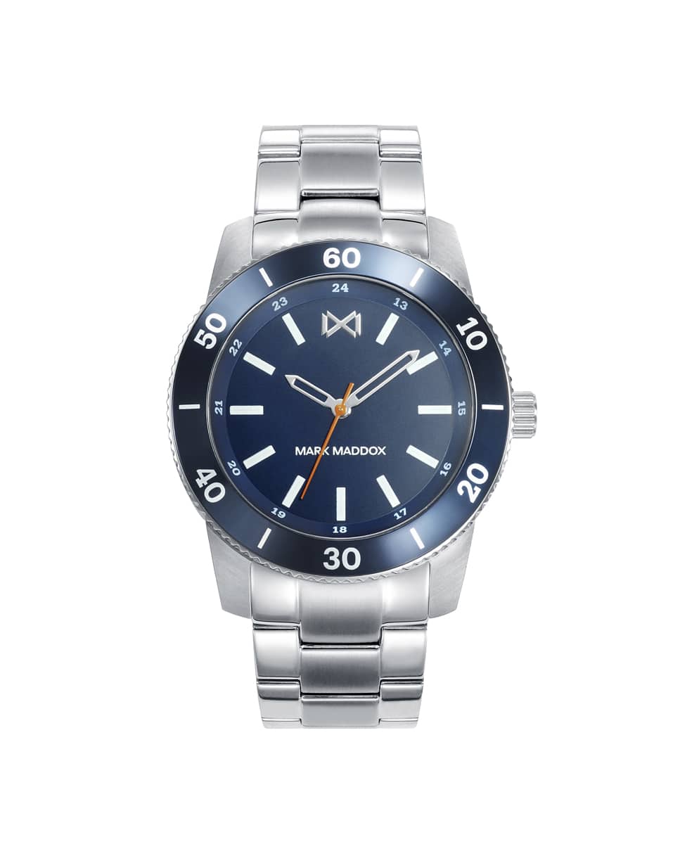 Reloj De Hombre Mark Maddox Mission Tres Agujas Con Caja De Acero Y Brazalete Sólido Integrado Del Mismo Material. El Bisel Es De Aluminio Azul, Esfera Del Mismo Color Con Los Índices En Blanco Y El Segundero Naranja
