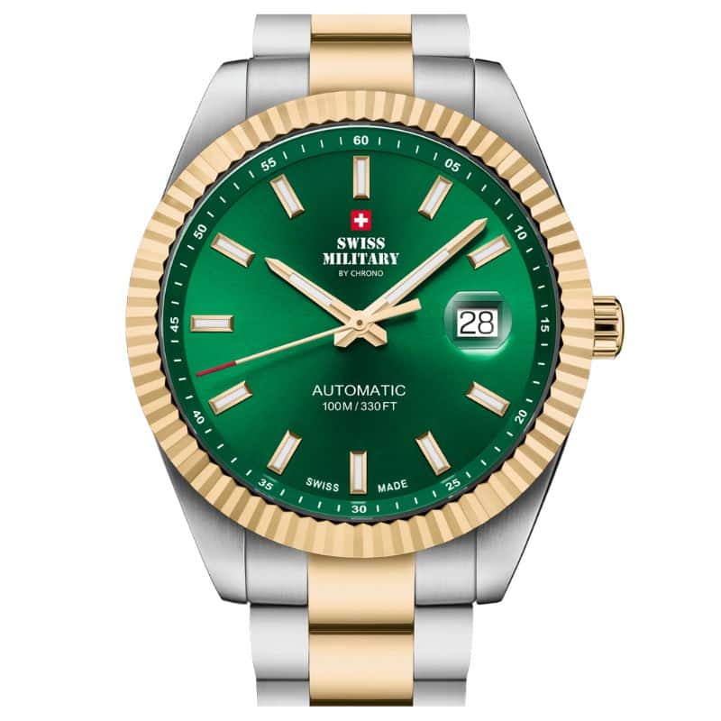 El Swiss Military SMA34110.08 destaca por su carácter elegante y distintivo dentro de la relojería suiza clásica, gracias a su sofisticada esfera verde con acabado efecto rayos de sol, que aporta profundidad y un estilo único según la luz. Este diseño se complementa con un refinado bisel estriado y marcadores luminiscentes, logrando un equilibrio perfecto entre tradición, funcionalidad y estética contemporánea.