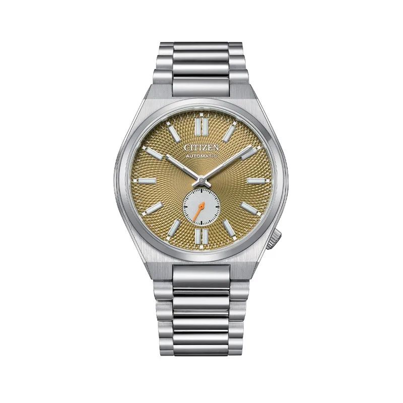 El Citizen Tsuyosa NK5010-51X Small Second Olive destaca por su equilibrio entre diseño contemporáneo y precisión mecánica. Su esfera en color verde oliva con acabado rayos de sol refleja una personalidad sofisticada y original, mientras que la subesfera de pequeño segundero a las 4 añade un toque técnico distintivo. La caja de acero inoxidable de 40 mm se combina perfectamente con un brazalete integrado, creando un conjunto visualmente armonioso y muy actual.