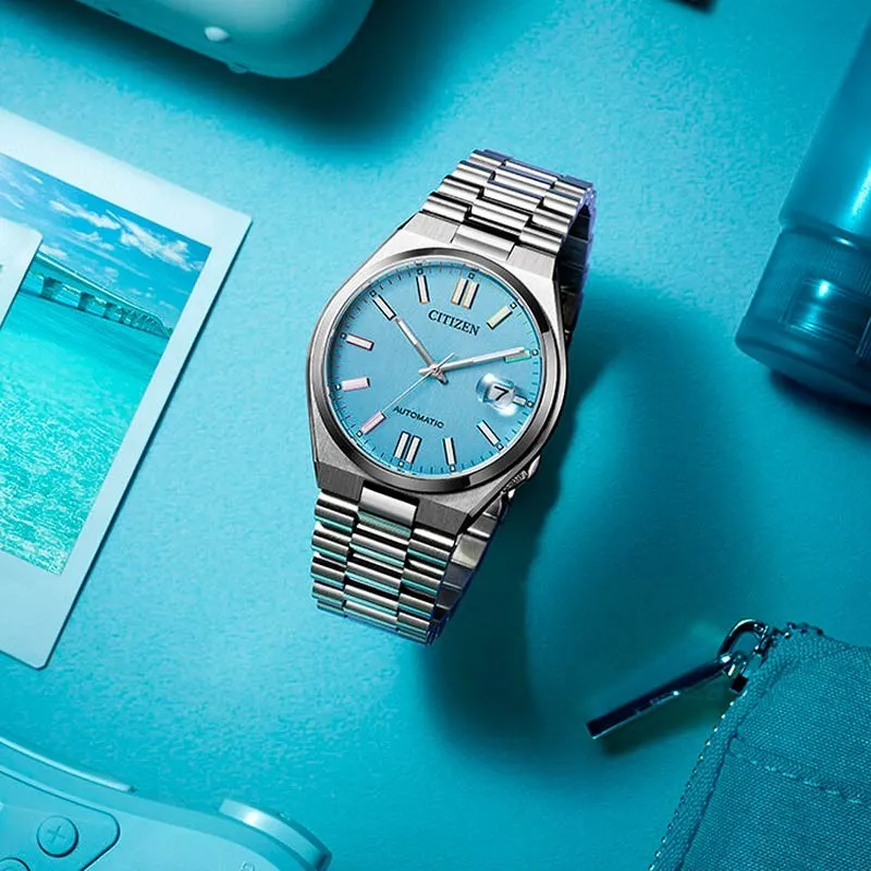 El Citizen Tsuyosa Special Edition es una pieza que combina elegancia y modernidad, destacando por su diseño refinado y detalles cuidadosamente elaborados. Su caja de acero inoxidable de 40 mm alberga una esfera azul celeste con un degradado sutil, complementada por índices multicolores que aportan un toque distintivo y contemporáneo.