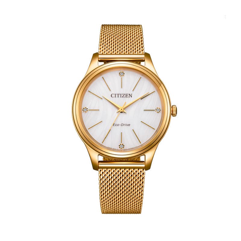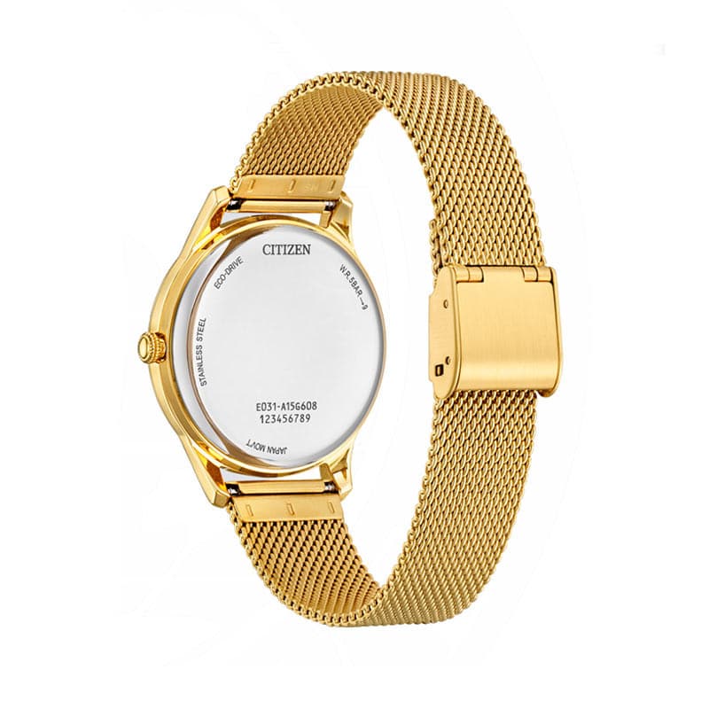 Reloj Citizen OF Collection Lady es un reloj femenino que combina elegancia refinada y tecnología eficiente en un diseño pensado para acompañar con distinción el día a día. Este modelo de 34 mm presenta una caja y brazalete de acero inoxidable con acabado dorado y malla milanesa, aportando una presencia delicada y sofisticada que se adapta con naturalidad a distintas ocasiones.