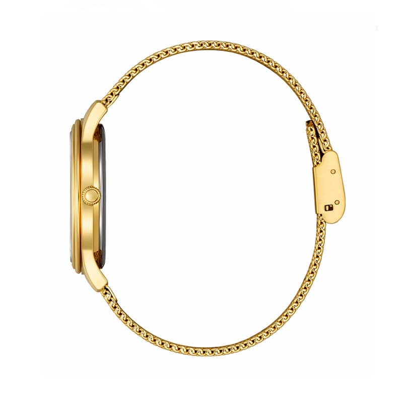El brazalete tipo mesh en acero dorado ofrece comodidad y ligereza, adaptándose suavemente al contorno de la muñeca con un ajuste seguro que acompaña cada movimiento. El cristal mineral protege la esfera frente al desgaste cotidiano, mientras que la resistencia al agua hasta 5 ATM (50 metros) permite una fiabilidad adecuada para el uso diario sin comprometer el estilo.