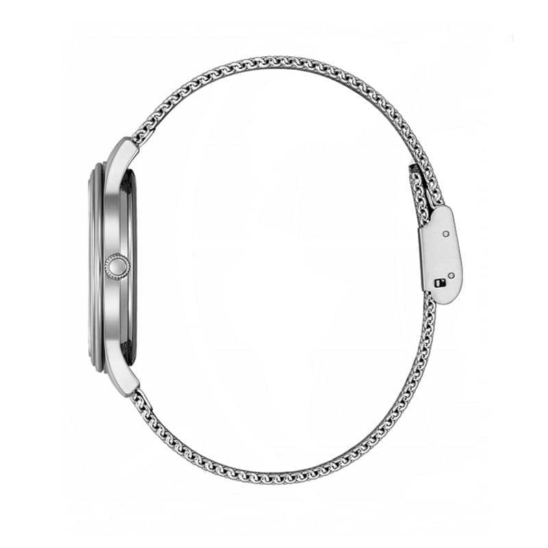 El brazalete de acero tipo malla milanesa combina comodidad y ligereza, adaptándose con naturalidad al contorno del brazo y ofreciendo un ajuste seguro y confortable. El cristal mineral protege la esfera frente al desgaste cotidiano, manteniendo una visibilidad clara y nítida del tiempo.