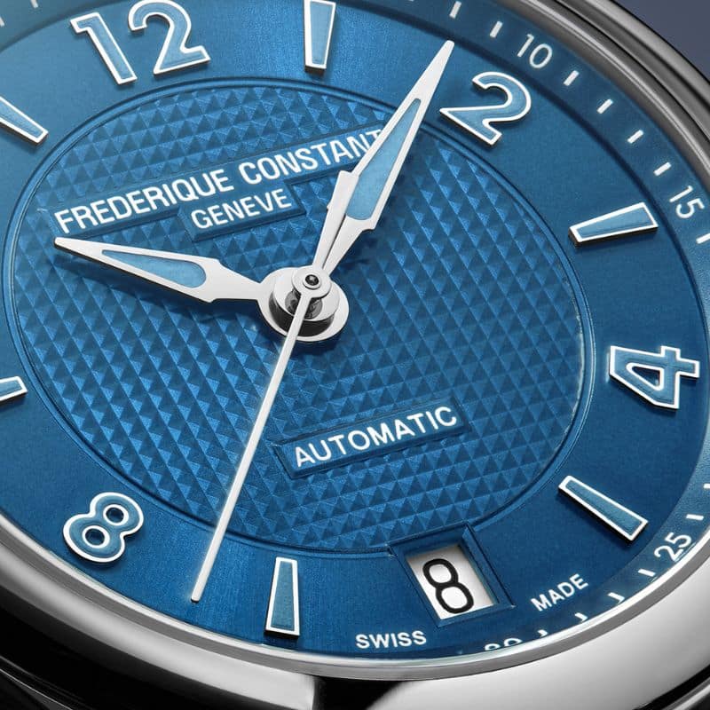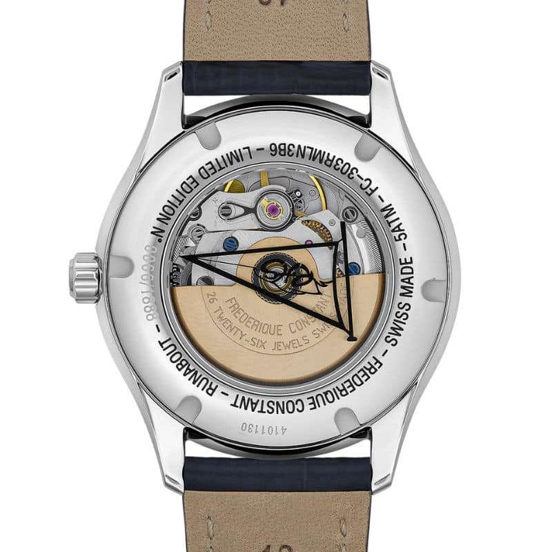 En su interior late el calibre automático FC-303, basado en el Sellita SW200, con una frecuencia de 28.800 alternancias por hora y una reserva de marcha de 38 horas. Este movimiento de 26 rubíes garantiza una precisión y fiabilidad excepcionales. A través del fondo transparente de la caja, se puede admirar el movimiento, adornado con los acabados tradicionales de la manufactura suiza, como las Côtes de Genève y el perlage.