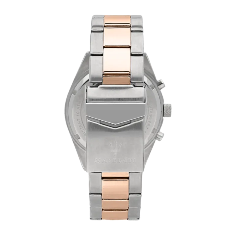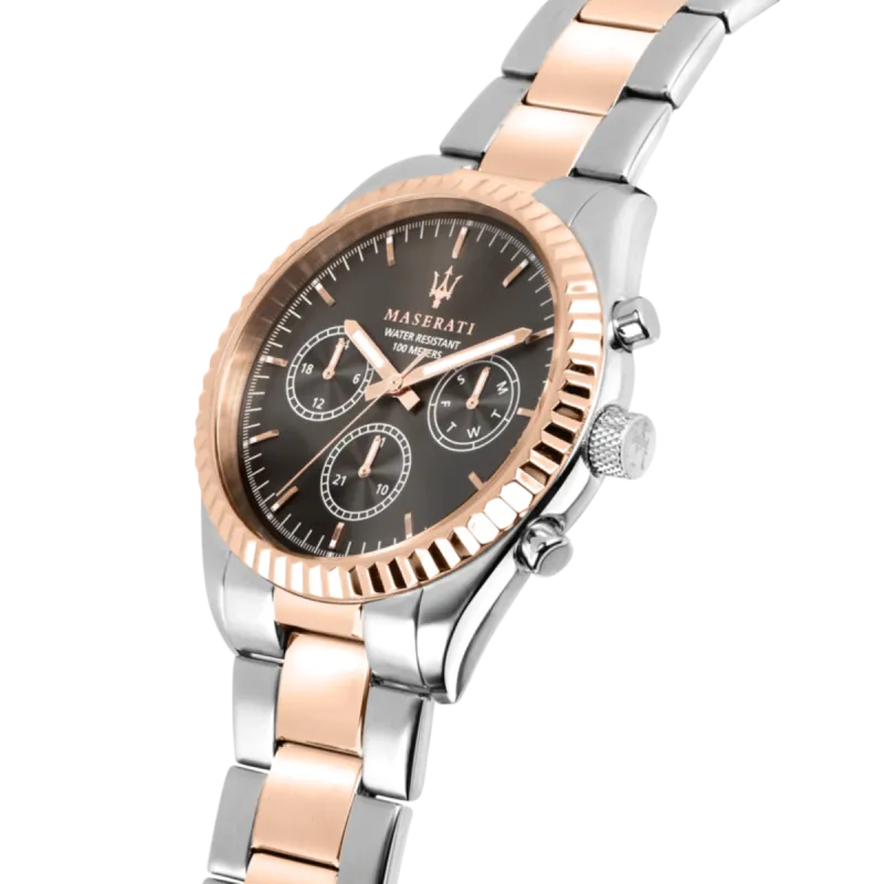Reloj Maserati Competizione multitono 43 mm con esfera gris antracita, detalles oro rosa, cronógrafo multifunción y movimiento Seiko VX9J. Carácter y precisión.