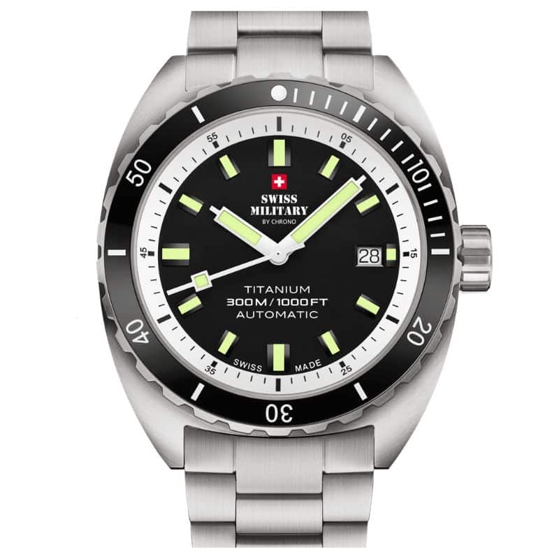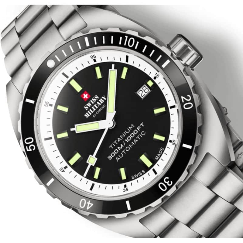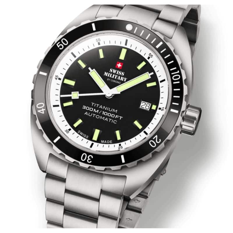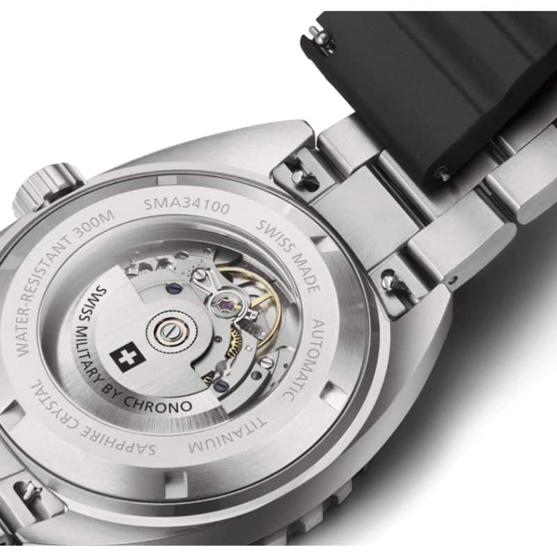 Swiss Military SMA34100.02 combina titanio ultraligero y precisión automática suiza con 300 m de hermeticidad.