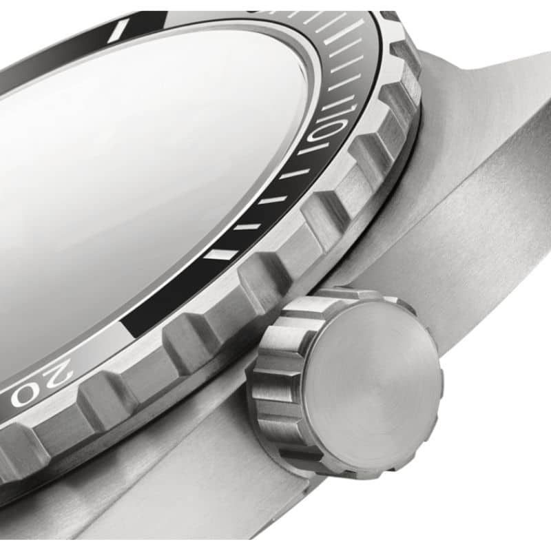 La protección de la esfera está asegurada por un cristal de zafiro antirreflejos y resistente a arañazos, que mantiene la claridad visual incluso en entornos exigentes. Combinado con la corona atornillada y una hermeticidad hasta 300 m (30 ATM), este reloj está preparado para acompañar inmersiones recreativas profundas y actividades acuáticas intensas sin comprometer su integridad estructural o su rendimiento.