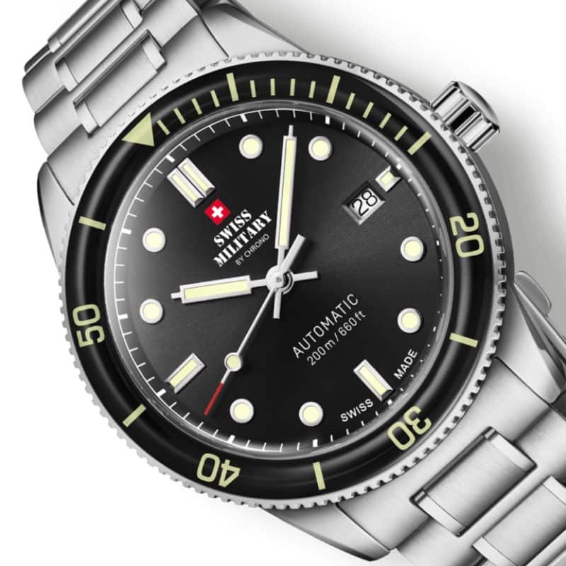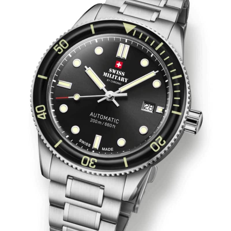Swiss Military SMA34106.01 es una oda a la tradición relojera suiza y al espíritu aventurero que define un guardatiempo de buceo de auténtico carácter. Diseñado para el hombre que exige tanto rendimiento como estilo, este reloj presenta una caja de acero inoxidable robusta de 41,5 mm, perfectamente equilibrada entre presencia y comodidad, que se combina con una esfera negra profunda adornada con índices y agujas luminiscentes para ofrecer legibilidad excepcional en todas las condiciones. El bisel de zafiro giratorio unidireccional, con números luminiscentes, aporta funcionalidad técnica y una estética imponente que captura tanto la profundidad del océano como la elegancia urbana.