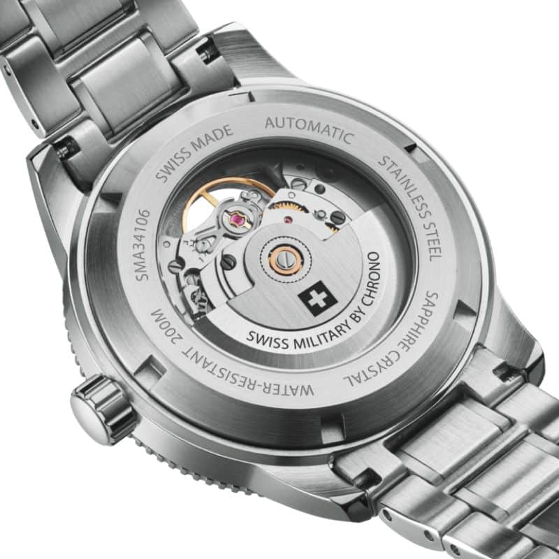 El reloj se completa con una pulsera de acero inoxidable con cierre desplegable seguro, que ofrece comodidad y estabilidad en cualquier situación, desde un traje de neopreno hasta una camisa formal. Respaldado por una garantía internacional de 5 años, este reloj no solo es un instrumento de medición del tiempo, sino una declaración de estilo y compromiso con la excelencia. Swiss Military SMA34106.02 se posiciona así como una elección distinguida para quienes buscan un reloj de buceo con auténtico pedigree suizo, diseño impecable y fiabilidad técnica sin concesiones.