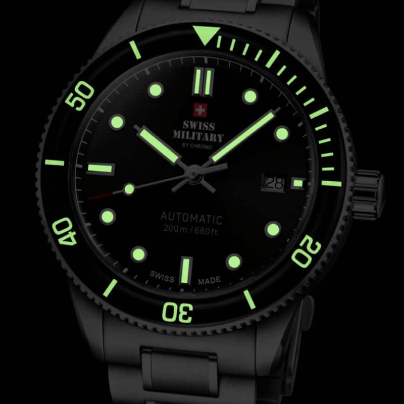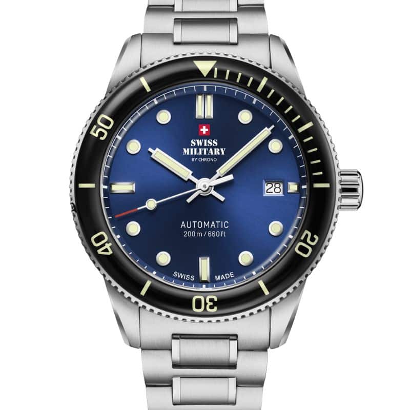 Swiss Military SMA34106.02 es la encarnación perfecta de un reloj de buceo profesional que combina robustez técnica con un diseño sofisticado y atemporal. Su presencia en la muñeca impone respeto sin resultar excesiva gracias a una caja de acero inoxidable de 41,5 mm meticulosamente trabajada, que protege una esfera azul profundo con índices y agujas generosamente tratados con material luminiscente, lo que garantiza una legibilidad excepcional incluso en entornos con poca luz. El bisel giratorio unidireccional, también acentuado con marcadores luminosos, no solo contribuye a la funcionalidad esencial bajo el agua, sino que realza su estética náutica con una deportividad refinada.
