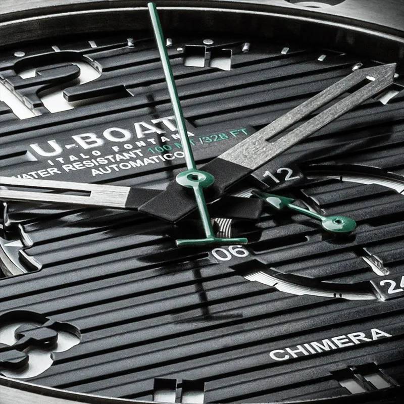 El U-Boat Chimera 46MM SS Nero 9605 es una edición limitada que representa la fusión perfecta entre ingeniería de precisión y diseño italiano con carácter. Su caja de 46 mm en acero inoxidable AISI 316L destaca por un imponente bisel de tungsteno pulido y tornillos visibles que refuerzan su estética industrial y sofisticada.