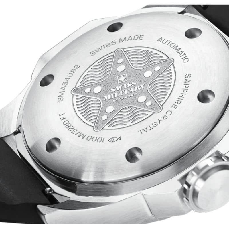 El Swiss Military SMA34092.02 es un auténtico reloj de buceo profesional diseñado para soportar condiciones extremas, combinando ingeniería suiza, resistencia y precisión en una pieza de alto rendimiento. Concebido para inmersiones profundas, este modelo alcanza una impresionante hermeticidad de 1000 metros (100 ATM), lo que lo convierte en un instrumento fiable tanto en entornos submarinos exigentes como en el uso diario más activo.