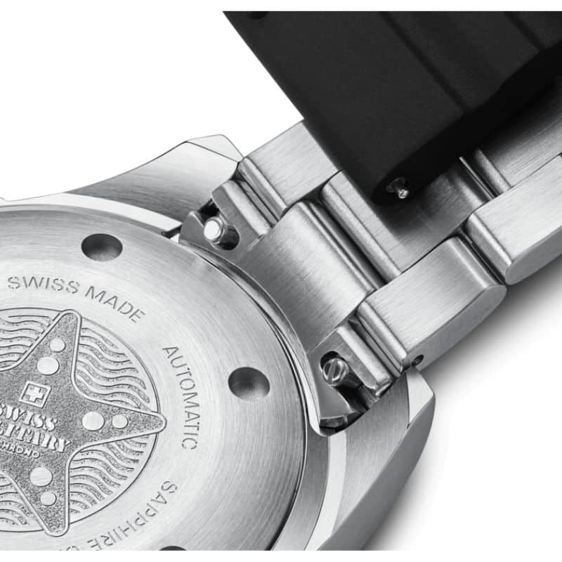 En su interior incorpora un movimiento automático Swiss Made (Sellita SW200 o Ronda R150), reconocido por su fiabilidad y precisión, con una reserva de marcha aproximada de 38–40 horas. Completa su equipamiento con sistema de cambio rápido de correa y una garantía internacional de 5 años, reflejando su calidad de fabricación suiza y su orientación a un uso intensivo.